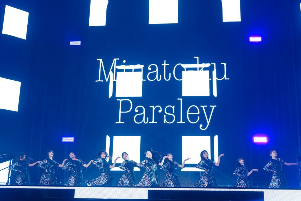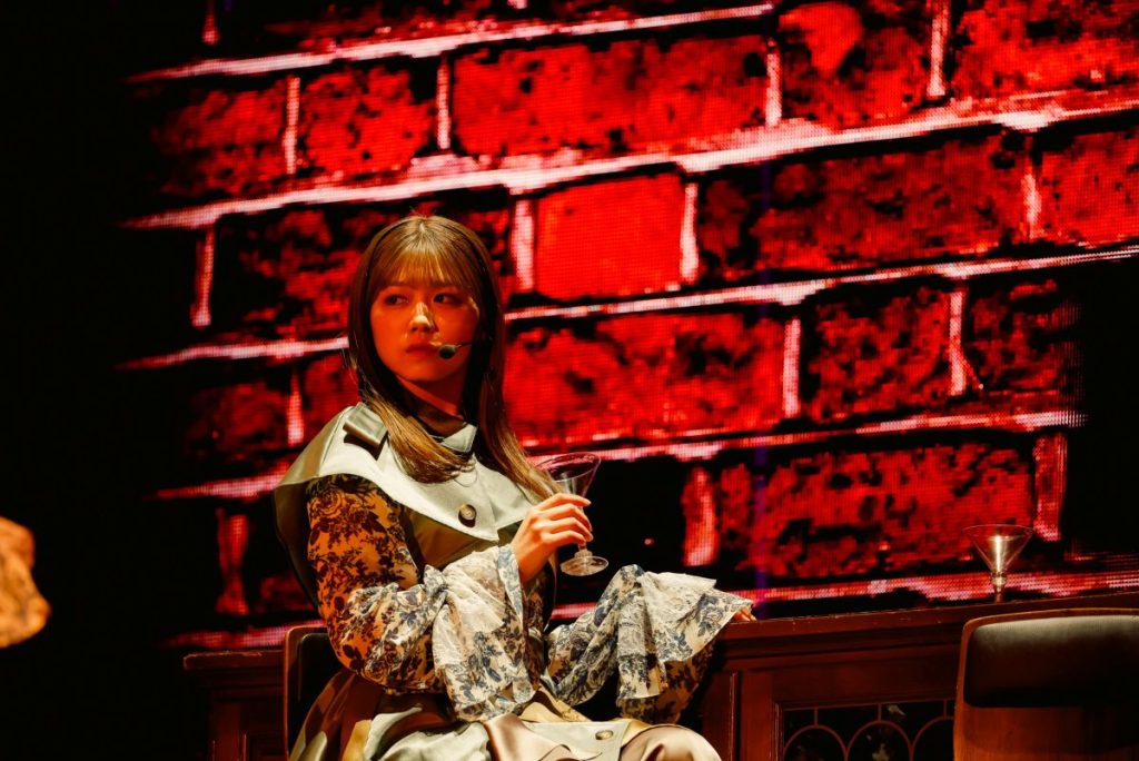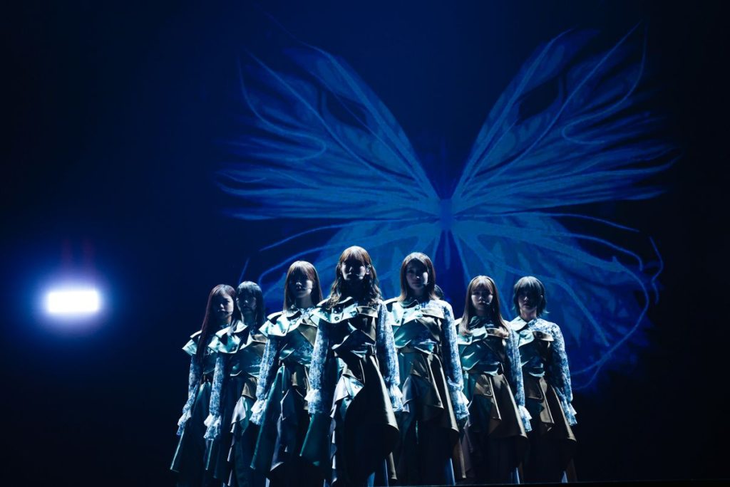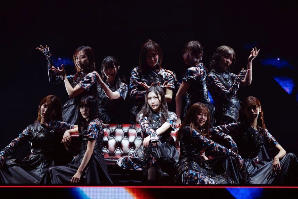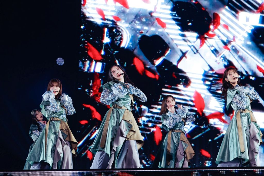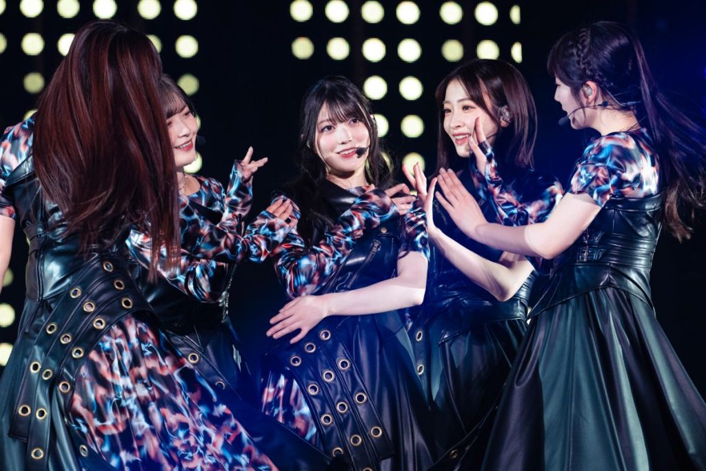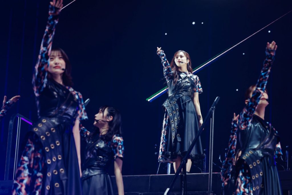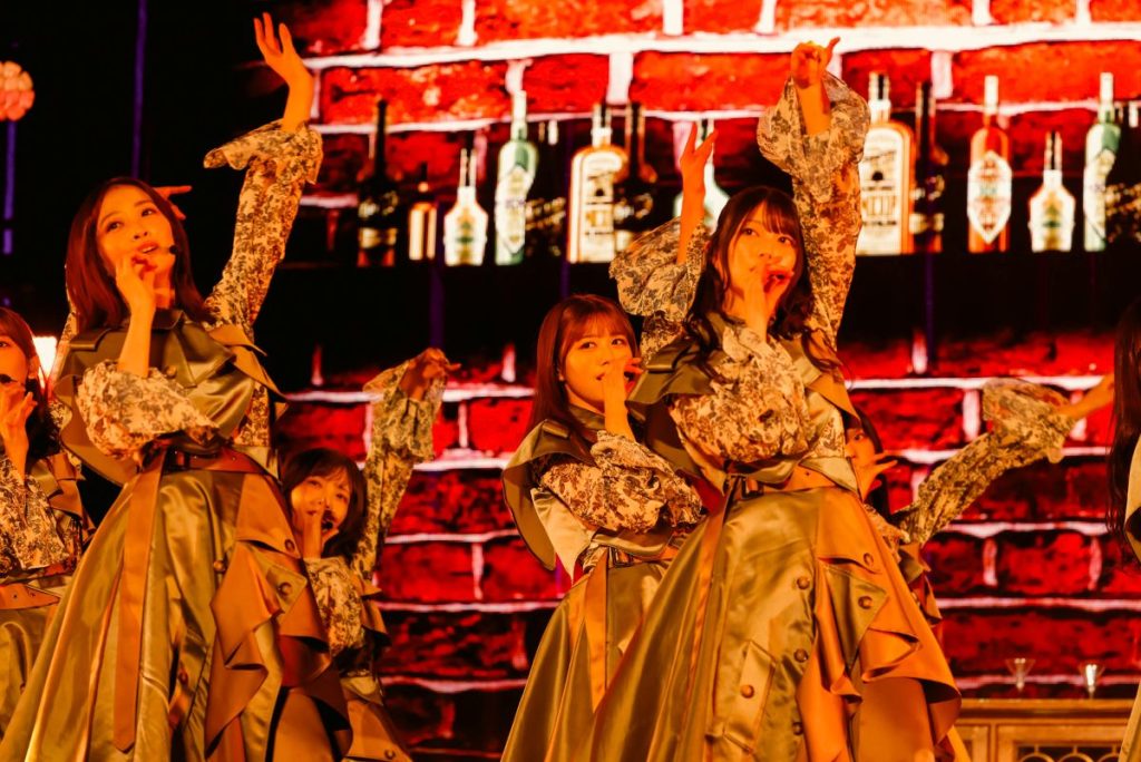 続く『ノンアルコール』ではバーカウンターをイメージしたセットを背景に、大人びた空気を漂わせながら歌い踊る。曲中、カクテルグラスを片手にした武元唯衣が大沼晶保、中嶋優月とストーリー性を感じさせる絡みを見せる場面も。『愛し合いなさい』では増本綺良を中心に、アイドル性の強いキラキラしたダンスでオーディエンスの目を奪った。